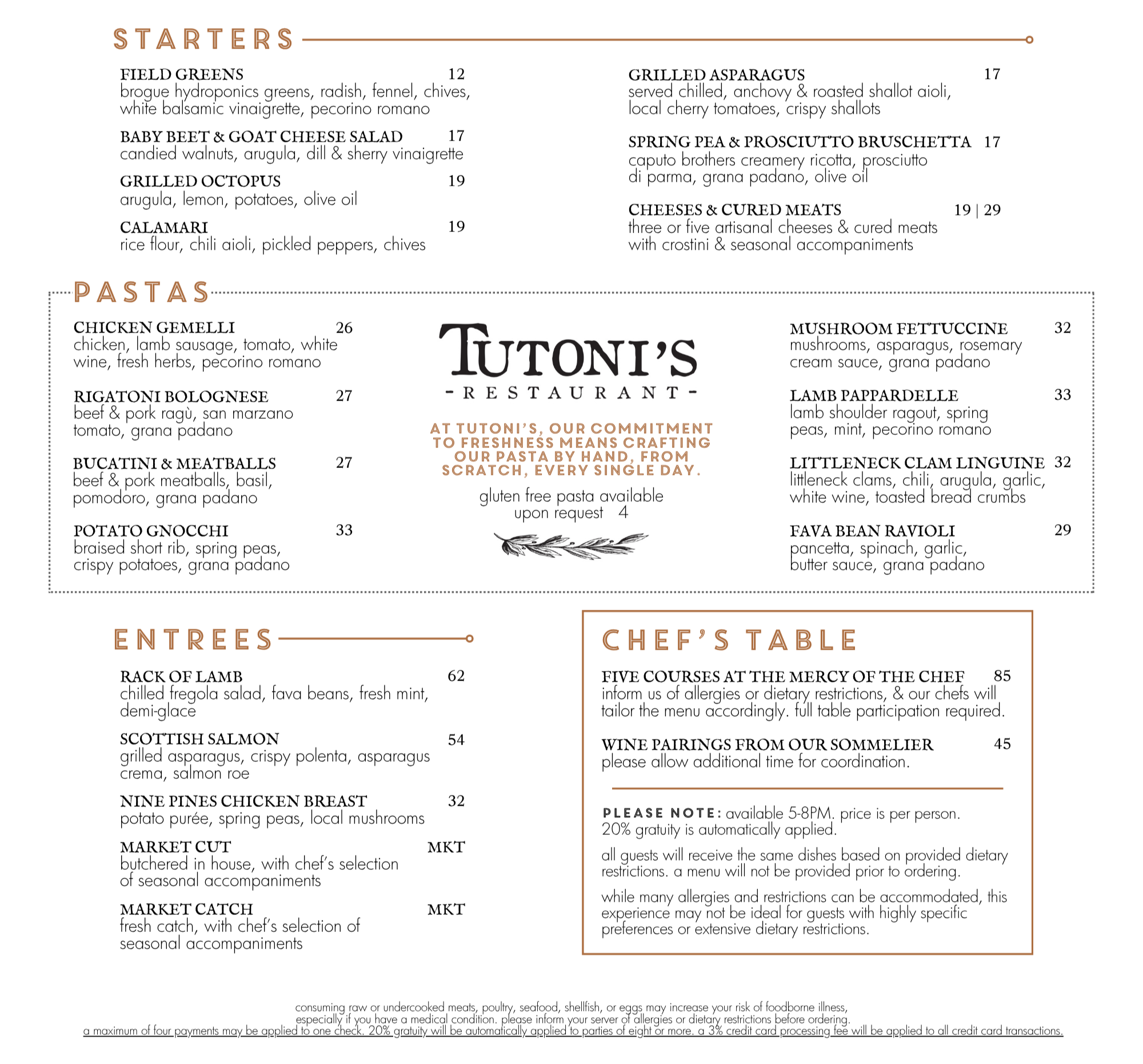 Tutoni's menu of creative dishes and new spins on traditional Italian standards offers customers a dining experience they can’t find anywhere else. We’re "taking it back to the old country" by providing authentic Italian flavors. We take pride in working with local farms and farmers: each seasonal menu emphasizes the best of the region’s abundant agricultural scene. At Tutoni's, seasonal makes sense and people are priority.